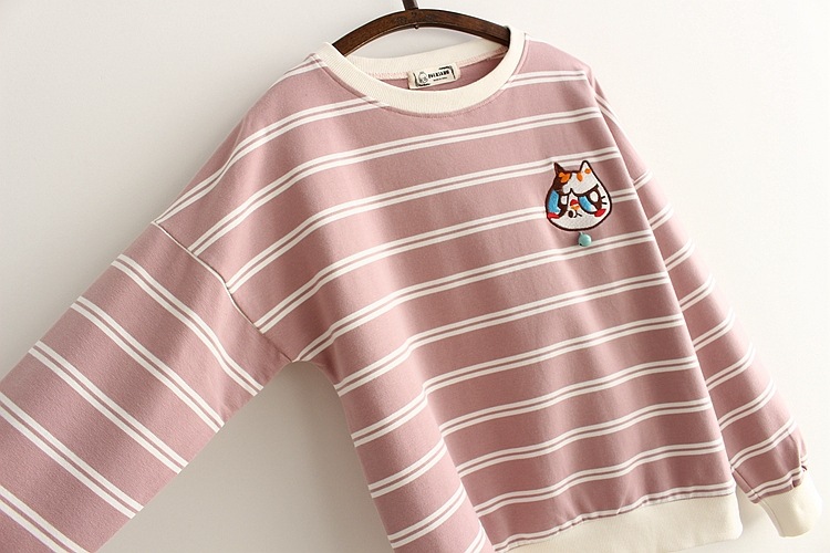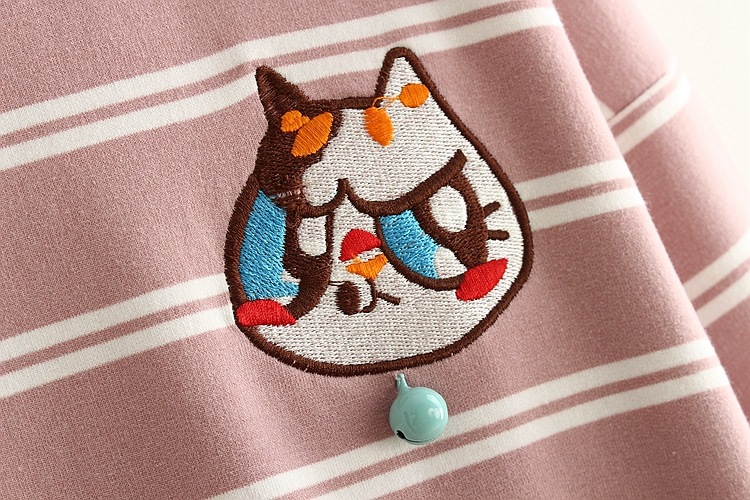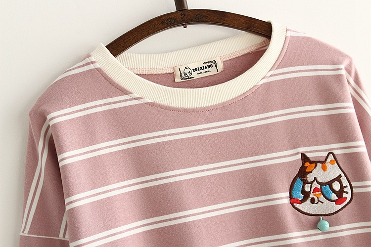 秋冬女裝新款鈴鐺貓頭鷹刺繡條紋衛衣女圓領套頭長袖打底衫RX6485